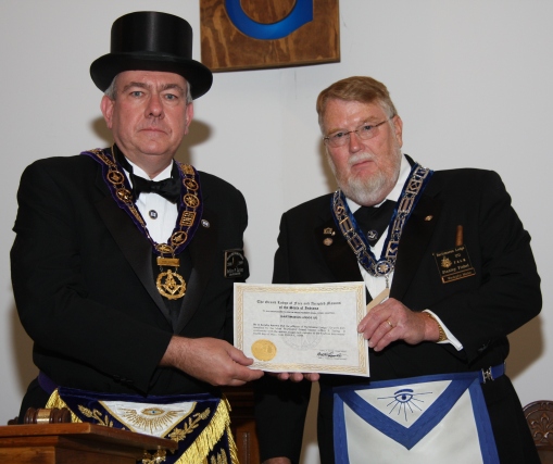 Grand Master Jeffrey P. Zaring presents the certificate authorizing the dispensation of Batimeaus Lodge for 2008 to installed Master of Bartimeaus Lodge Stanley Fishel, twice past master of Nashville Lodge 135. |