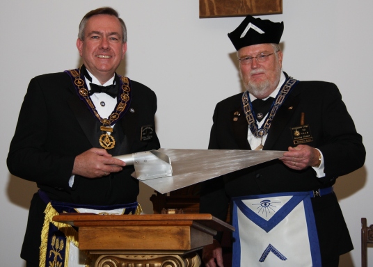 Stanley Fishel Worshipful Master 2008 Bartimeaus Lodge UD presents a special gift to the Jeffrey P. Zaring, Grand Master of Indiana. A trowel to fit the office of Grand Master. (May 24, 2008) |